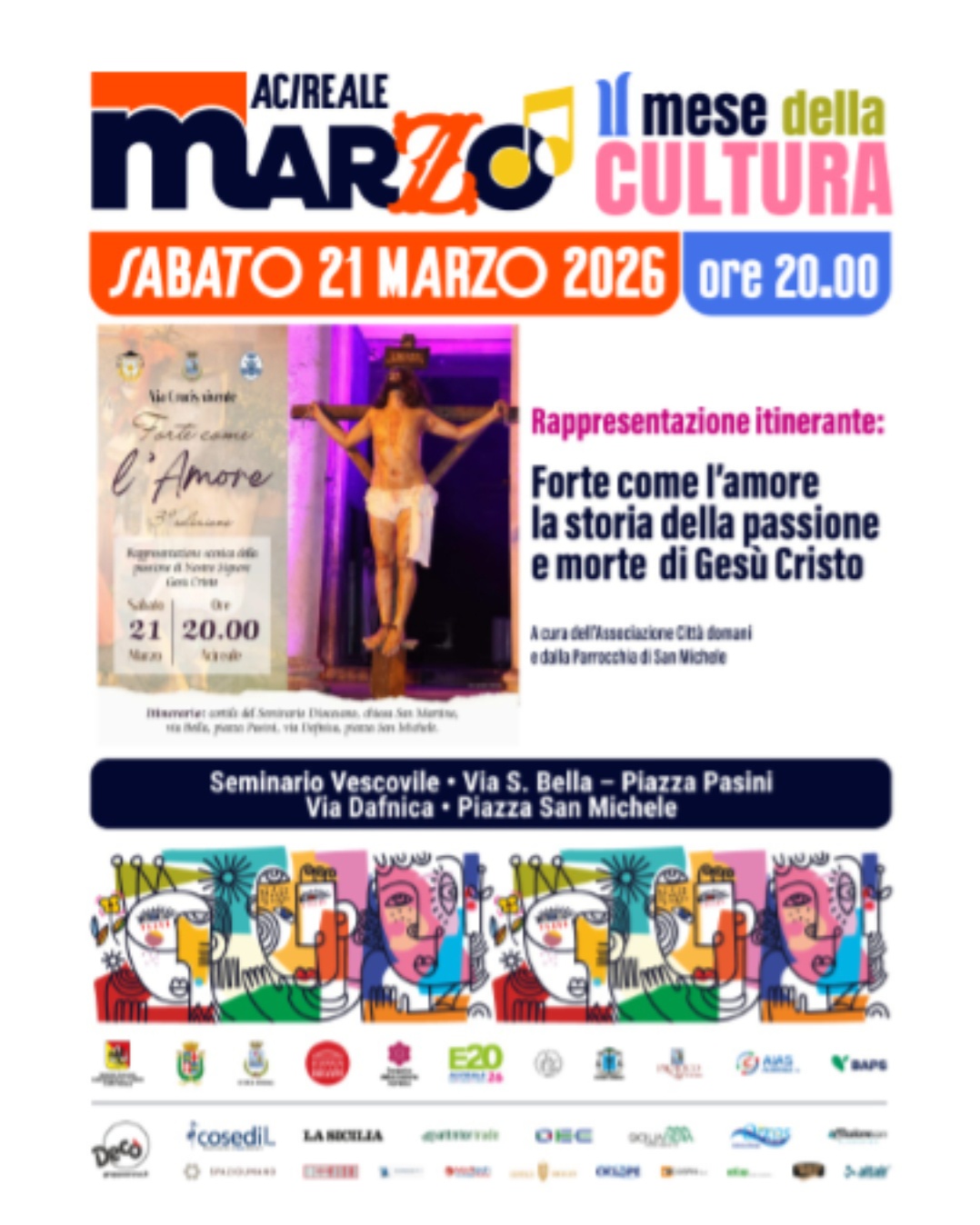 La terza edizione di “Forte come l’amore” si terrà sabato 21 marzo, con inizio alle 20, è sarà articolata attraverso un itinerario che si snoderà dal Seminario diocesano per passare dalla chiesa di San Martino e procedere verso via Salvatore Bella, piazza Pasini, via Dafnica e piazza San Michele. L’evento, giunto alla terza edizione, consiste in una “Via Crucis” vivente, promosso dall’associazione “Città domani”, presieduta da Massimiliano Tropea, e dalla parrocchia San Michele, guidata da don Marcello Pulvirenti, con l’apporto determinante del consigliere comunale Francesco D’Ambra, autentico punto di riferimento per il quartiere interessato.