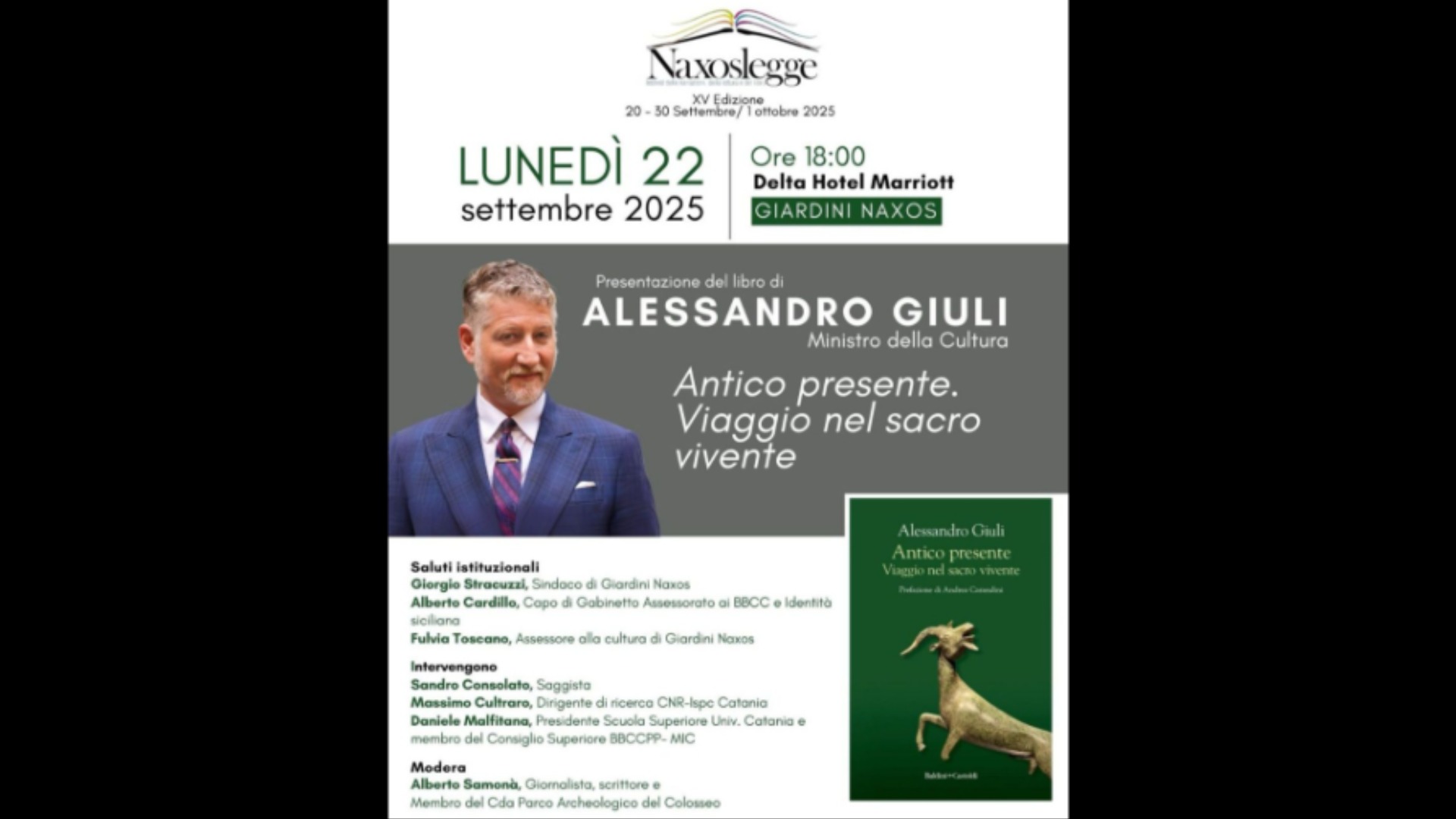𝘓𝘶𝘯𝘦𝘥𝘪̀ 22 𝘴𝘦𝘵𝘵𝘦𝘮𝘣𝘳𝘦 2025, 𝘢𝘭𝘭𝘦 𝘰𝘳𝘦 18, 𝘢𝘭 𝘋𝘦𝘭𝘵𝘢 𝘏𝘰𝘵𝘦𝘭 𝘔𝘢𝘳𝘳𝘪𝘰𝘵𝘵 𝘥𝘪 𝘎𝘪𝘢𝘳𝘥𝘪𝘯𝘪 𝘕𝘢𝘹𝘰𝘴, presenteremo il libro di 𝗔𝗹𝗲𝘀𝘀𝗮𝗻𝗱𝗿𝗼 𝗚𝗶𝘂𝗹𝗶, 𝗠𝗶𝗻𝗶𝘀𝘁𝗿𝗼 𝗱𝗲𝗹𝗹𝗮 𝗖𝘂𝗹𝘁𝘂𝗿𝗮, “𝘼𝙉𝙏𝙄𝘾𝙊 𝙋𝙍𝙀𝙎𝙀𝙉𝙏𝙀. 𝙑𝙞𝙖𝙜𝙜𝙞𝙤 𝙣𝙚𝙡 𝙨𝙖𝙘𝙧𝙤 𝙫𝙞𝙫𝙚𝙣𝙩𝙚”.
